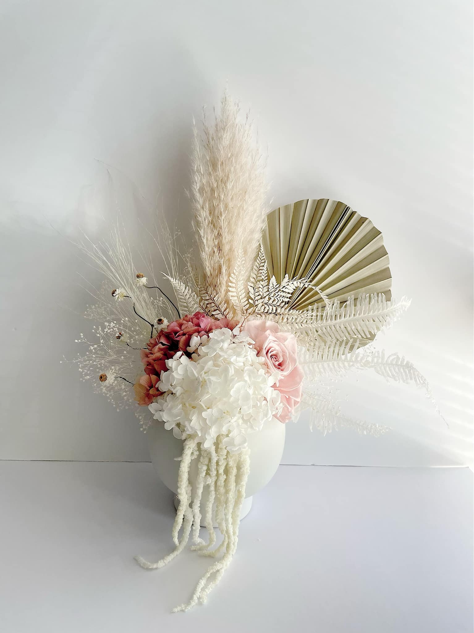 This beautiful fish bowl neutral pink tone with pampas grass elegant presentation.